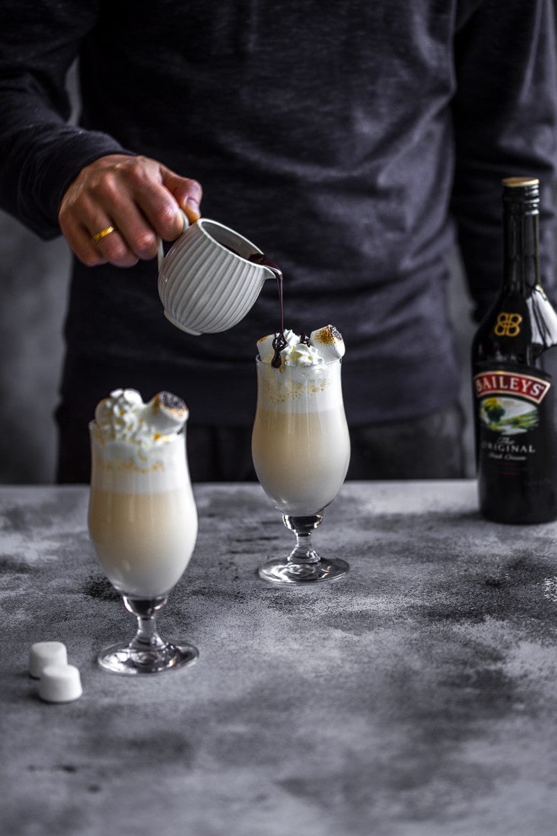 - To serve, pour Baileys shake in two tall 500ml capacity footed glasses. Top with whipped cream and marshmallows. Toast the marshmallows using a cooking blow torch. Drizzle with the hot fudge sauce and serve immediately.