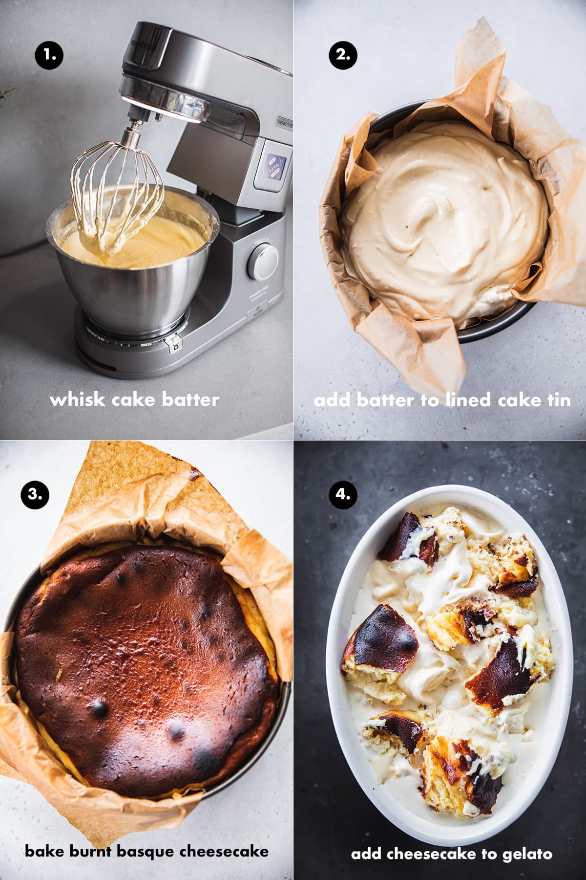 - Chilling Times - Chilling times are very important for this recipe. The baked Burnt Basque Cheesecake has to be chilled for at least 10 hours. So does the gelato mix before you churn it. And finally, the finished and assembled gelato needs to freeze overnight or for at least 10 hours before you serve it.
