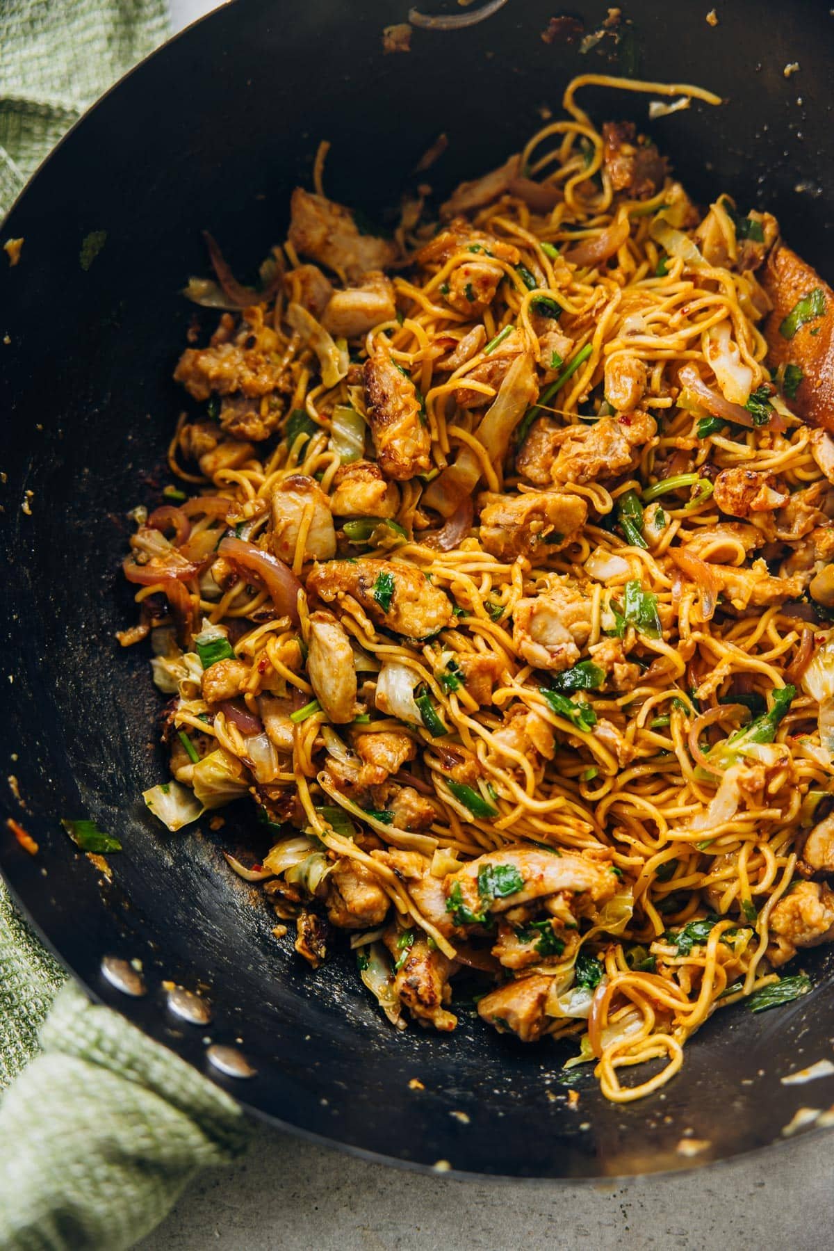 - Add the remaining oil to the wok. Add onion and stir-fry for a minute until onion is glazed. Add cabbage, spring onion, garlic and ginger. Cook for 1-2 minutes until fragrant. Add cooked noodles, chicken and MSG if using. Add the stir fry sauce. Stir-fry for 2-3 minutes, tossing constantly until mixed well and heated through. Test to check if chicken is thoroughly cooked.