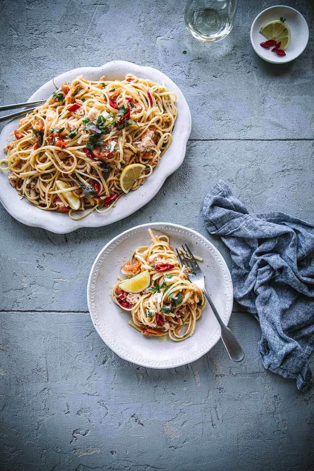 A non-saucy light seafood pasta brimming with lemony fresh flavours and a subtle hint of chilli is all you need on a Friday evening as you casually slip into the weekend, a chilled glass of white in hand (which goes really well with this dish). My delicious Chilli Crab Linguini takes only 15 minutes to cook from fresh crab meat and is just the most divine explosion of flavours.