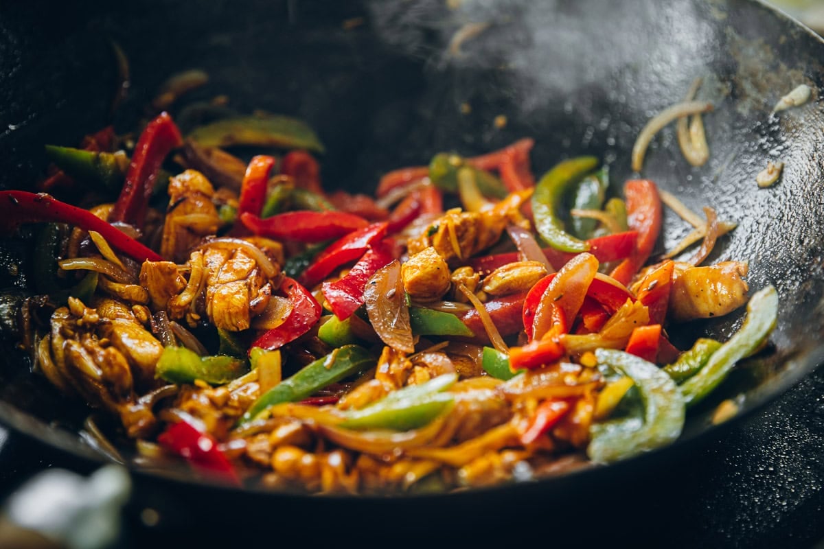 An easy Indian chicken stir-fry; Chicken Jalfrezi originates in eastern India. The dish is punctuated by chicken cooked in a screaming hot pan/wok with lots of red capsicum/bell pepper, onion and spices. It has base notes of tomato and chilli with a distinct sourness that comes from either lemon juice or vinegar.
