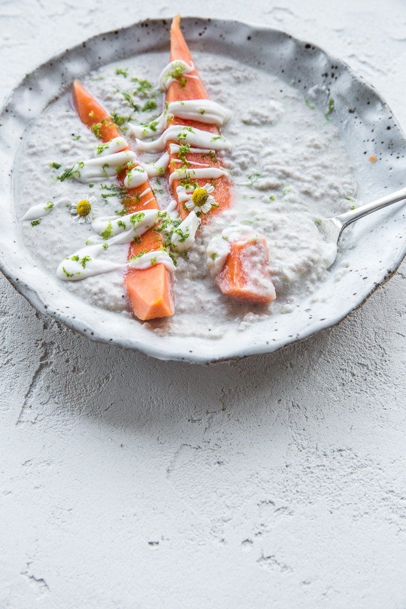 - Garnish with grated lime zest and papaya slices. Serve with extra coconut cream/milk.