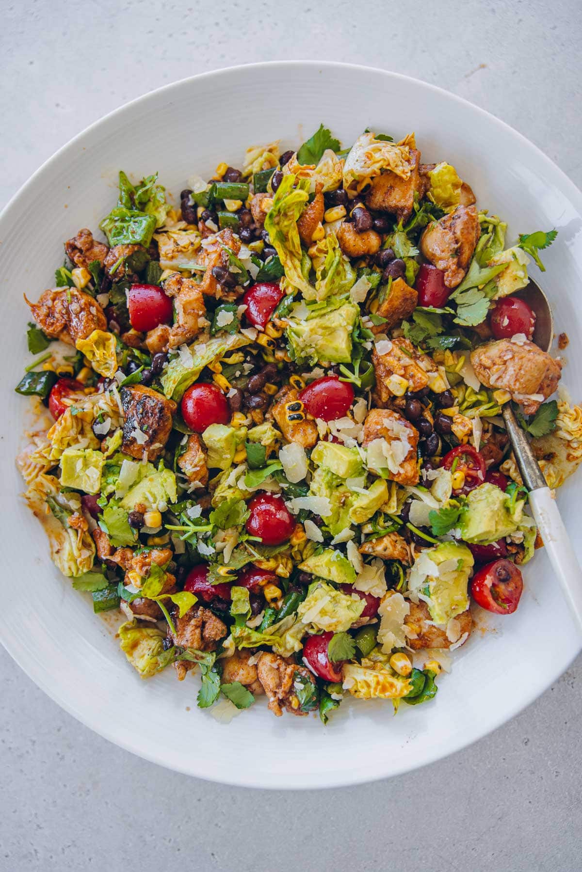 Mexican Chicken Salad in a white bowl with serving spoon.