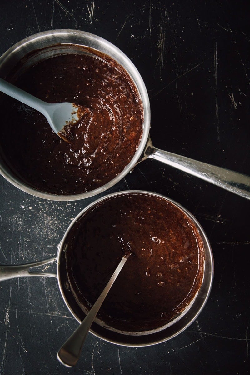 - Melt butter, chocolate and sugar in a medium-sized, heavy-bottomed saucepan on low heat. When the butter has pooled and chocolate just melted, remove from heat and mix well. Add marmalade and salt. Mix well and allow to cool for 10 minutes.