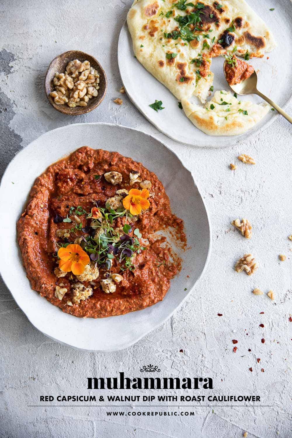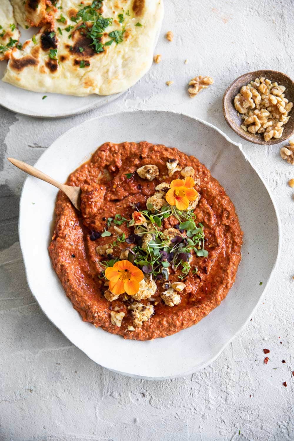 - Spoon the red capsicum dip (muhammara) in a medium serving bowl. Create swirling dips with the back of a spoon and drizzle with extra olive oil (if using). Top with crushed walnuts, chilli flakes, micro herbs and edible flowers. Serve warm with pita bread.