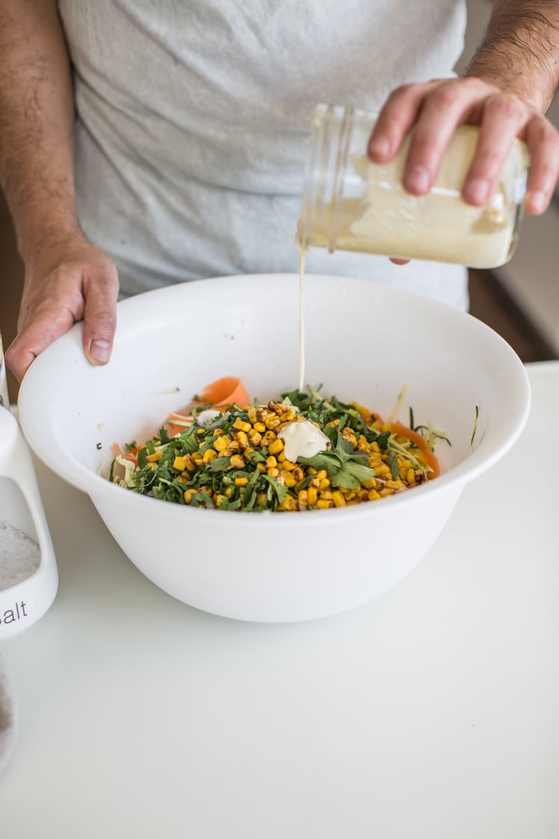 Over the weekend, I explored the book some more. It is seriously stunning with some great recipe inspiration, a lot of fusion happening amongst the pages. As opposed to the first couple of books which have recipes that are great but long winded, this one has many many straightforward recipes that surprise you. Maybe I have just gotten quicker at putting things together over the years, but it is a cookbook I am looking forward to imbibe my summer with. I made the same coleslaw again, this time with a few variations of my own. I didn't have fresh corn on hand (shocking!) as we have been known to devour any corn cob in sight lately, so I opened up a can of corn kernels and proceeded to char them on a hot pan. I also added raw zucchini strips and a generous drizzle of my favourite Brookfarm macadamia oil in the dressing. The nuttiness of the oil was beautiful with the corn. Nick was enlisted for the pictures and he quite enjoyed the hand tossing of the salad. This is truly one of those get-your-hand-in-the-bowl kind of salad because of the abundance of textured veggies and very little dressing. It is therefore imperative to get in there and make sure the veggies are coated well with that punchy mustard ridden creamy dressing.