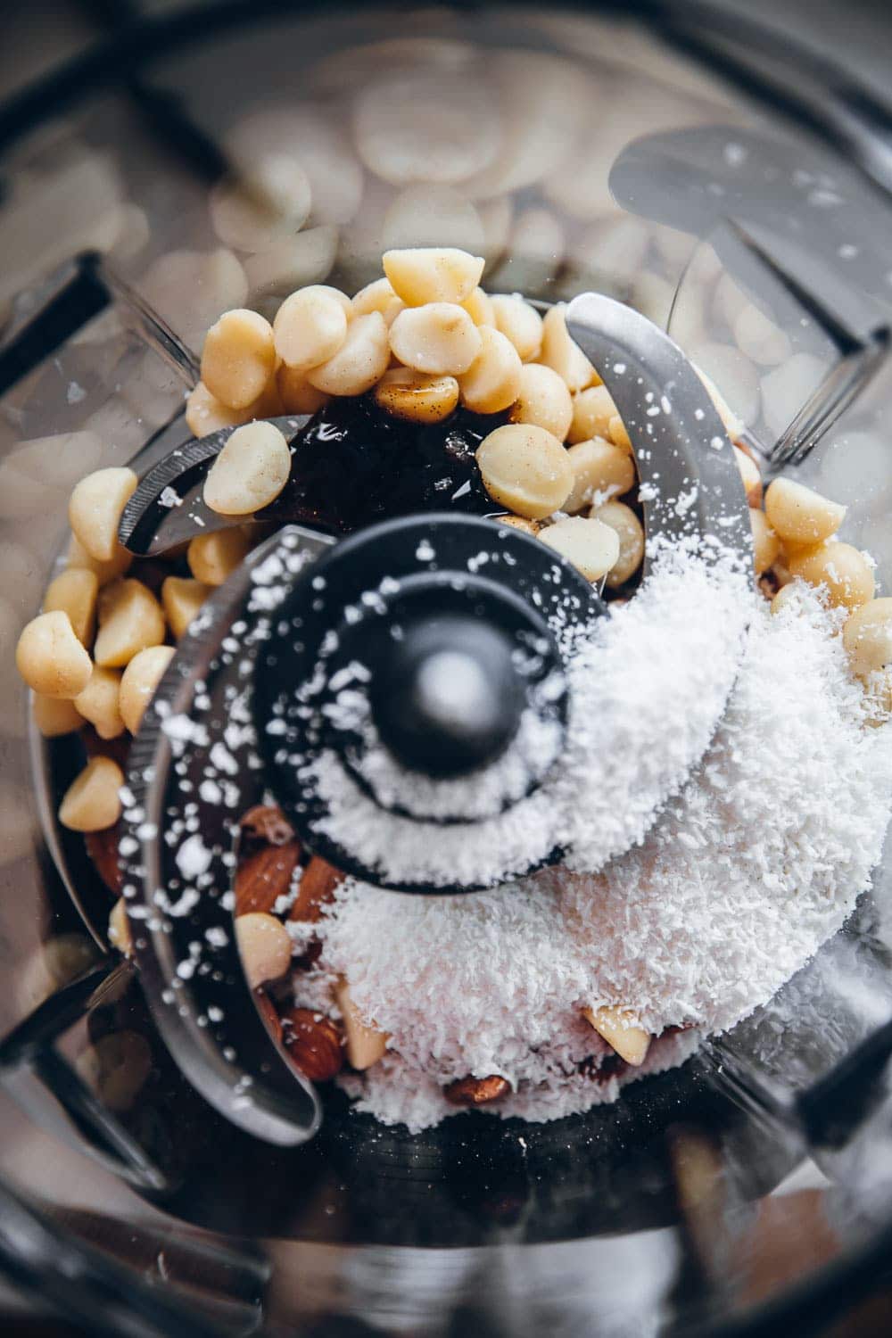 - Add dates, almonds, macadamias, coconut, vanilla and salt to a small food processor.