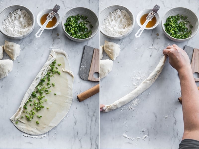 - Divide dough into four portions. Dust a clean workbench lightly with flour. Using a rolling pin, roll your dough out into a thin rectangle shape. Brush the rolled portion with sesame oil. Scatter spring onions onto the brushed oil leaving a 1/2 inch margin all around. From the top, start rolling the dough onto the spring onion into a cigar shape. Make sure you roll it tight so that the dough is wrapped tightly around the spring onions. Pinch and seal the ends. Starting at one end, coil the cigar roll until you reach the other end and are left with a 4 inch coiled disc. Flatten the coiled disc with the palm of your hand and dust with flour. Using a rolling pin, roll the coil into a 5 to 6 inch round pancake. Repeat with the remaining dough portions.