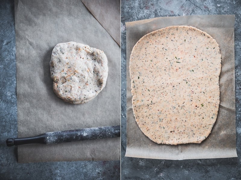 - Flatten dough and place between two large sheets of baking paper. Using a rolling pin, roll the dough out to about 0.3 or 0./4 cm thickness. remove the top baking paper. Using a fluted cutter or knife, cut the dough into desired shapes (squares, rectangles or triangles). Separate the strips and pieces slightly, so they don't stick together after baking. (if you are using a cracker roller, you don't need to separate) Prick each piece with a fork. Lift the baking paper and place the crackers with the baking paper on to the tray.